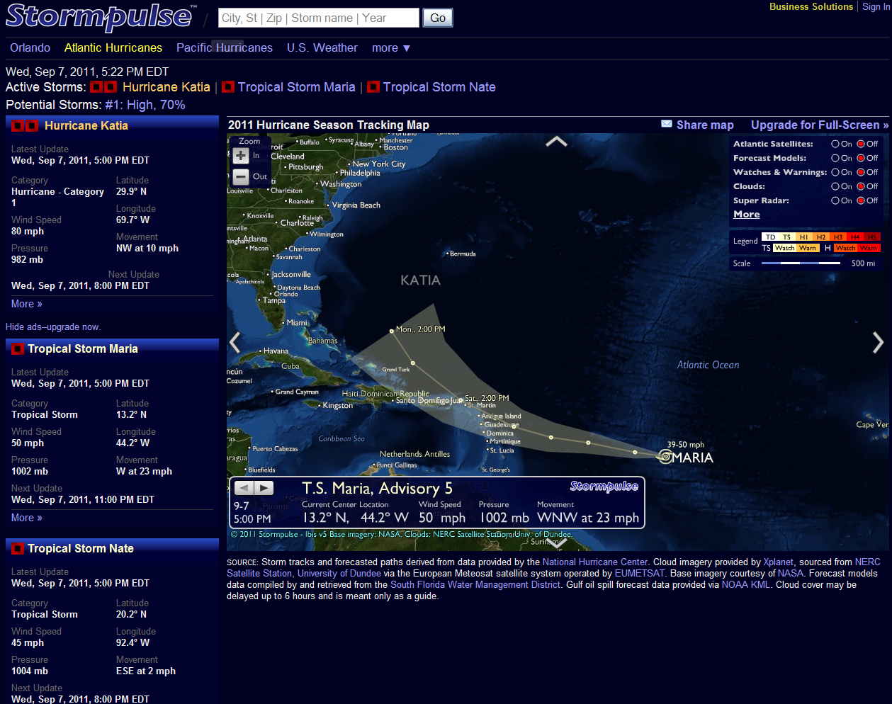 The Stormpulse.com image here shows that Katia should be around 700 miles due east of us, which is less powerful than Bill, less than Earl, but still on track to give us multiple days of great surf.