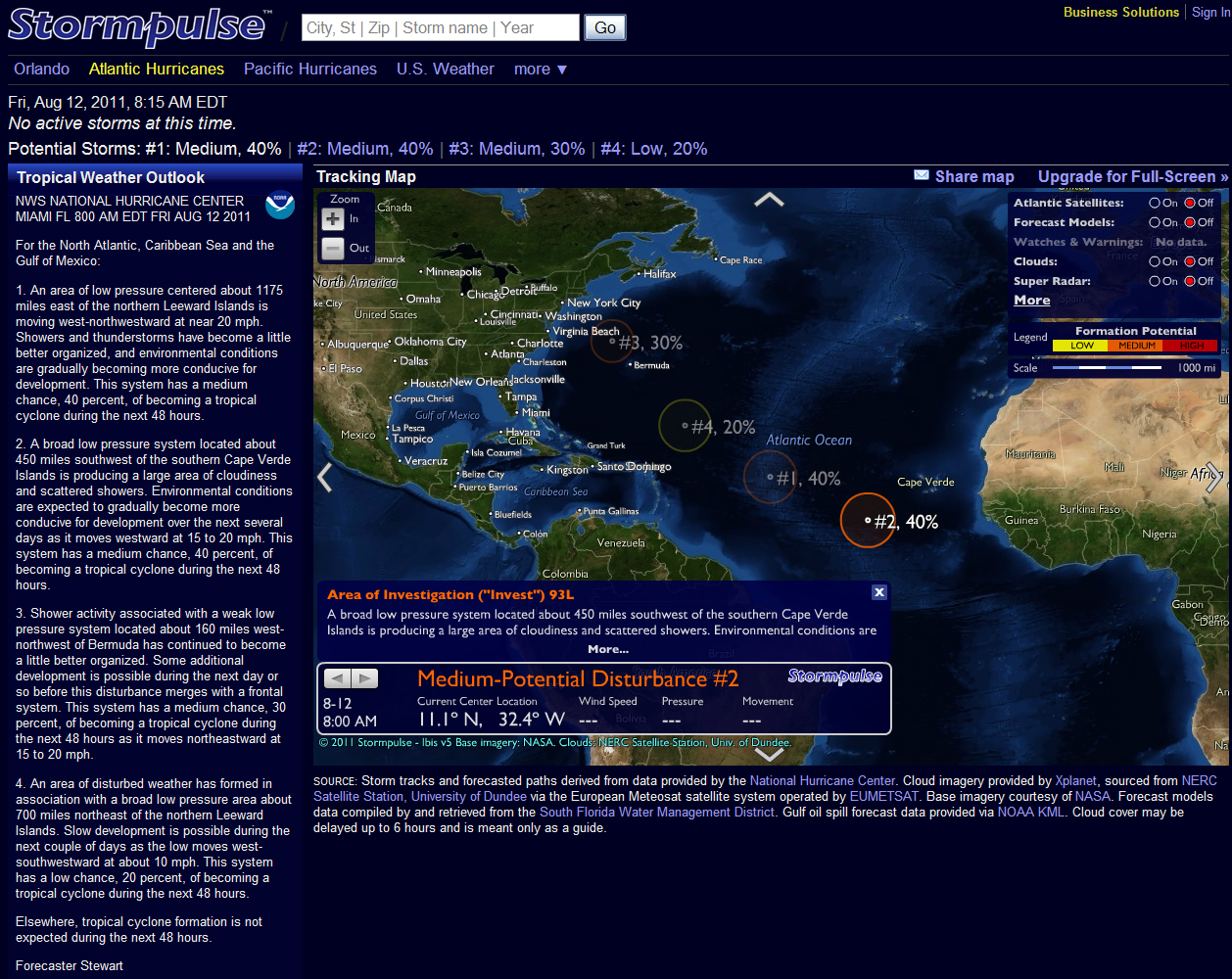 FRIDAY MORNING UPDATE OF YESTERDAYS POST ON TROPICAL DISTURBANCES! We have 2 each 40% Trop. Disturbances and one 20% that have a chance of becoming a Cyclone (Hurricane, yeah I know you know 🙂 , all three came from our normal storm birthing ground, that of the Cape Verde Islands off the coast of Africa. The image is compliments of Stormpulse.com my favorite hurricane tracker site.