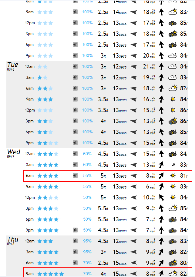 Monday and Tuesday, for 2 days running now show South winds as the Cane starts sending us chest high waves Monday on up to overhead waves by Tuesday, so this is Playalinda and Spanish House type wind. Offshore in both places. If you don’t want to drive, then surf anywhere south of 6th Street South and at least it will be 3 to 6 degrees offshore with direct South winds. RC’s and Hightowers it would be around 10 degrees offshore, and by the way, right now its only showing around 10 to 12 mph South winds so it could be really fun Monday and Tuesday.