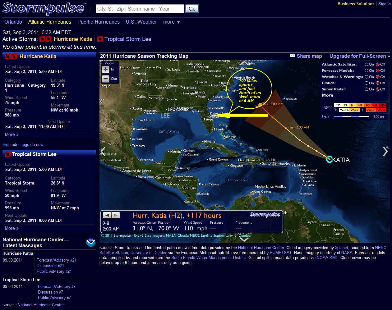 The Stormpulse.com image here shows that Katia should be around 700 miles due east of us, which is less powerful than Bill, less than Earl, but still on track to give us multiple days of great surf.