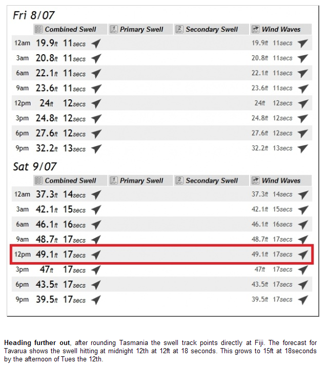 Okay, the crazy first screenshot image above is a massive swell getting ready to hit Tasmania, the chart is showing 49 feet at 17 seconds, insane. As this swell moves on, it is supposed to hit Fiji with greater intensity than the 40 to 50 foot swell that hit Fiji last year, so when the video come out, my addiction for big wave videos will have those ready for you from YouTube, Vimeo and/or Magicseaweed.com