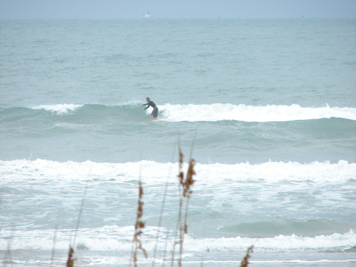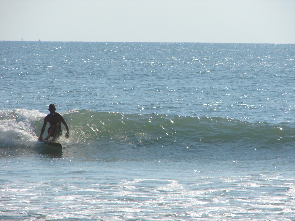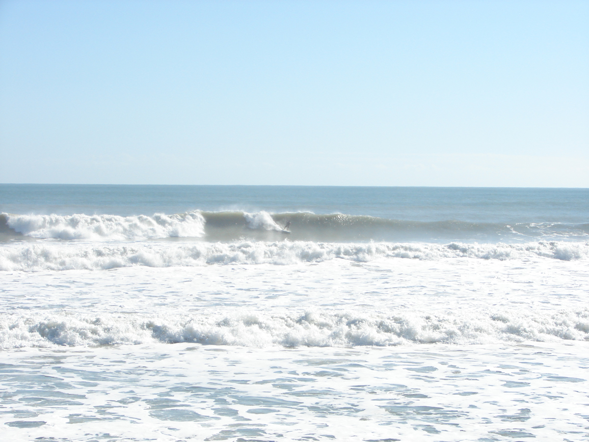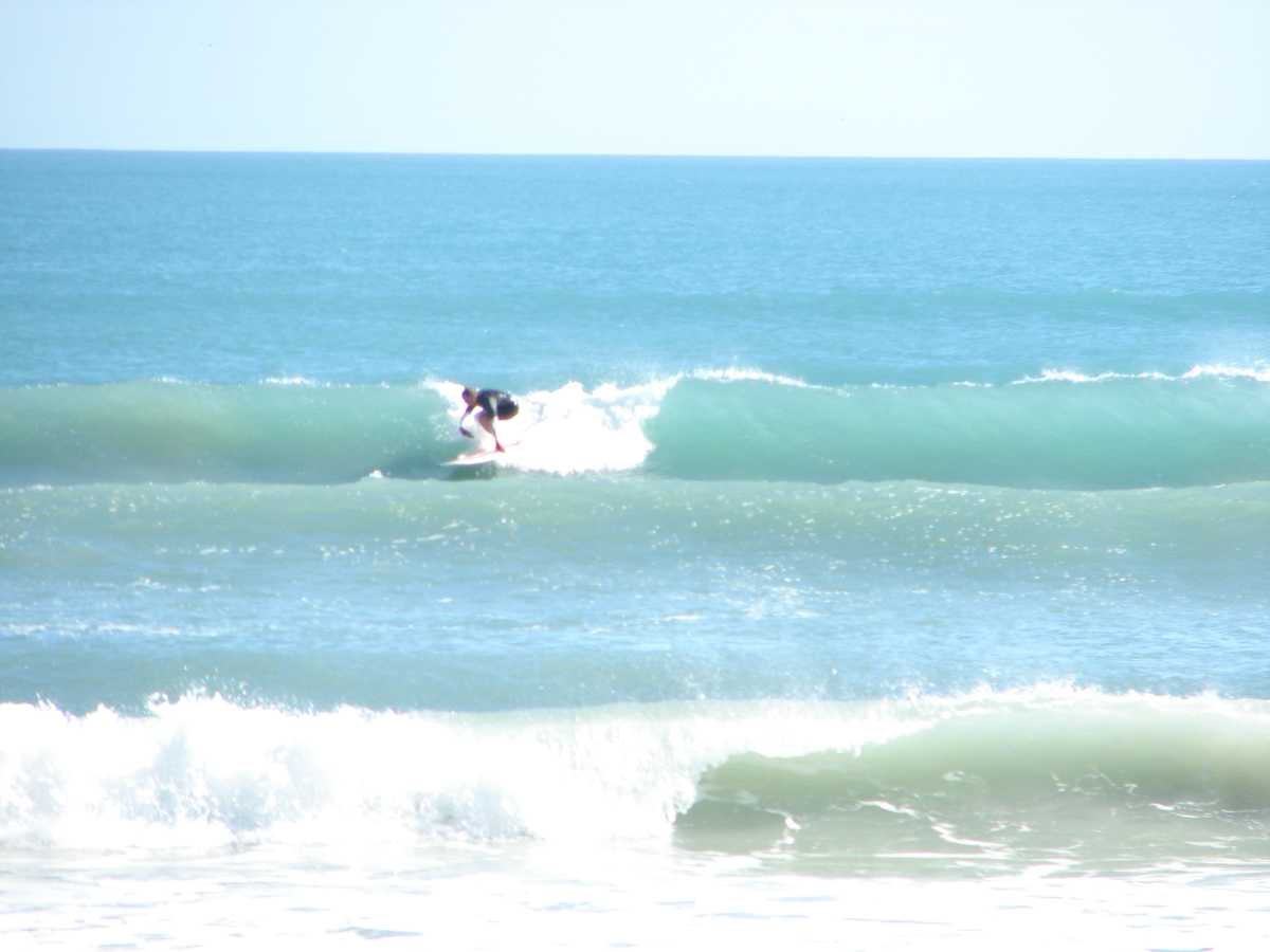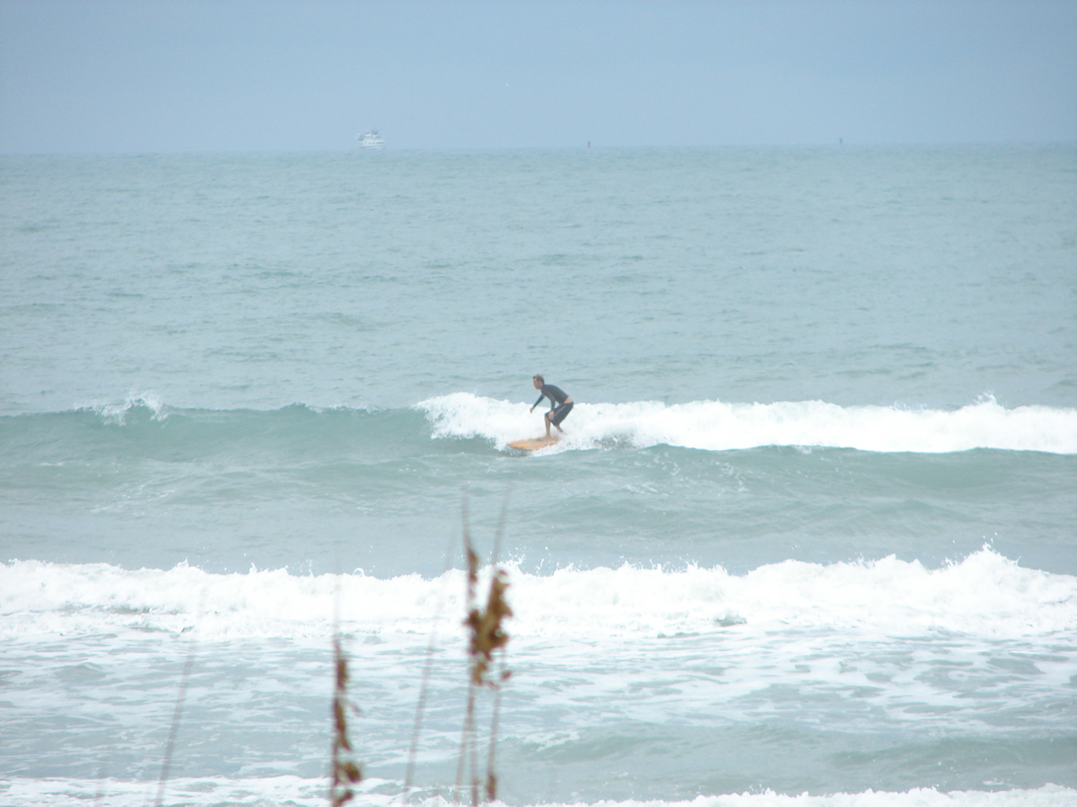 We still had some waist high waves at Johnson Avenue, even some chest high sets rolled through for Chad out there. It was a little cleaner before noon, but it looked fun even from 2:00 to 2:40. Chad must have got 10 or 12 waves in the 35 minutes I was on the boardwalk, lefts and rights. I believe he frustrated the 5 newbies with foam boards in the water next to him, cause they got out of the water after his 4th or 5th ride in a row 🙂