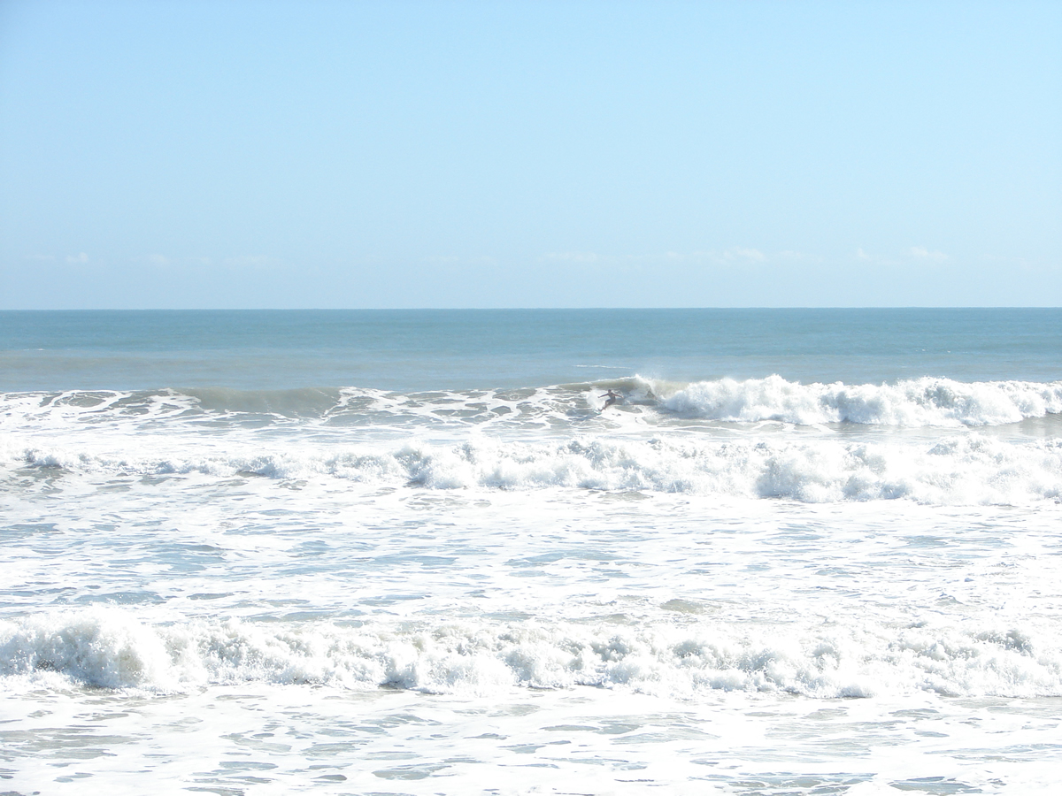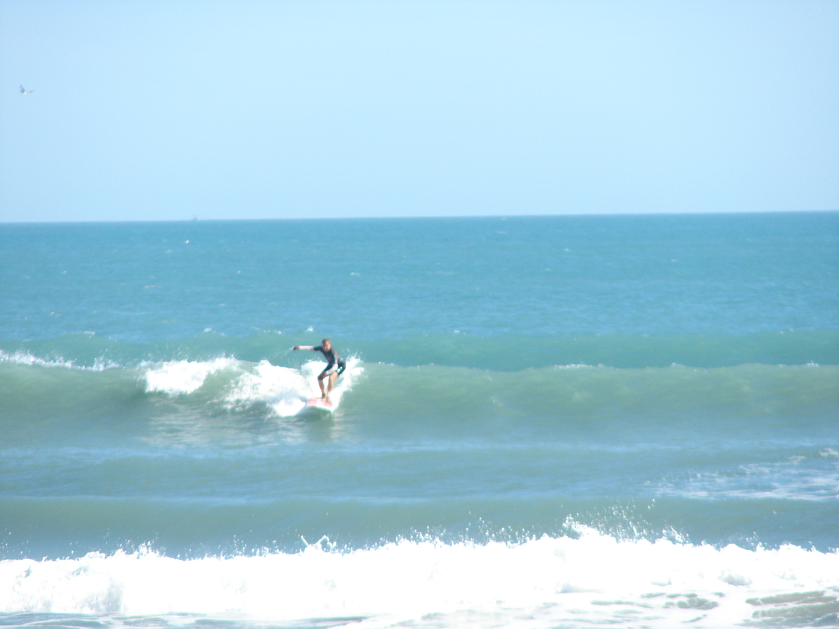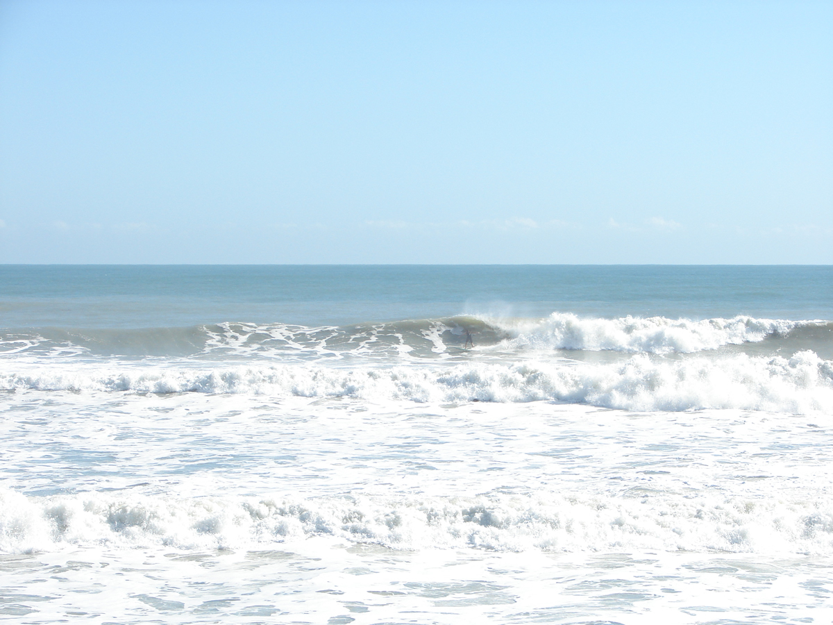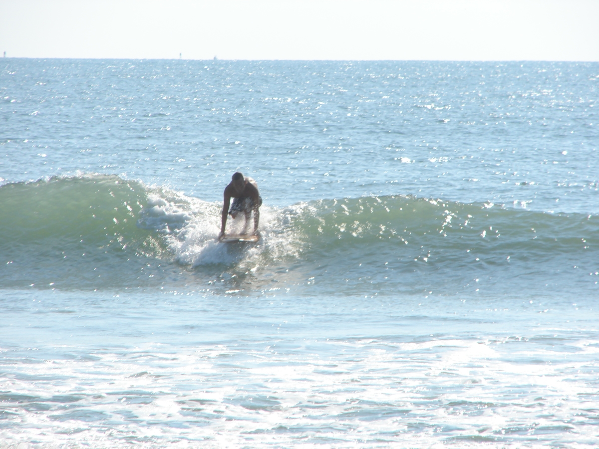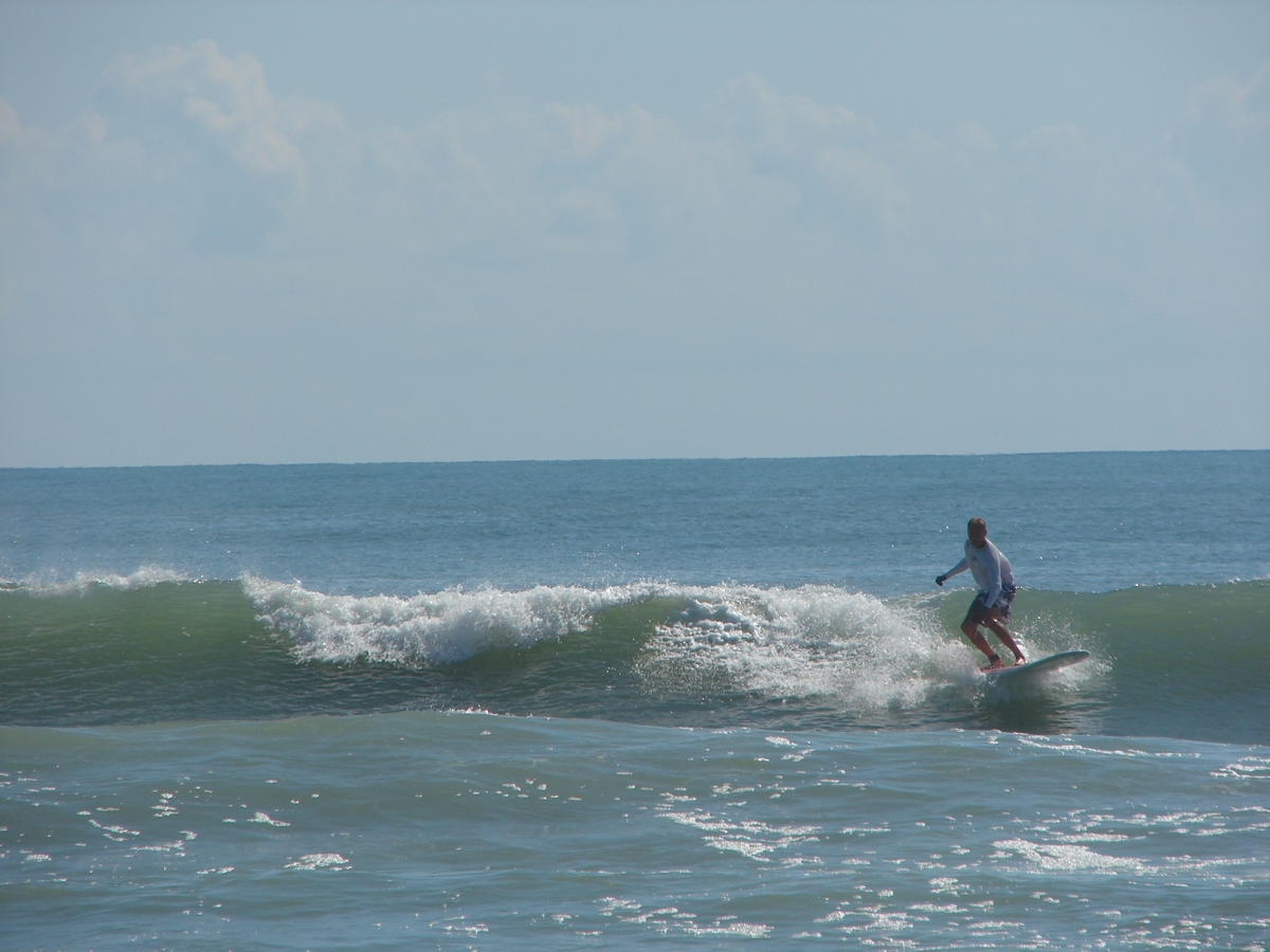 We still had some waist high waves at Johnson Avenue, even some chest high sets rolled through for Chad out there. It was a little cleaner before noon, but it looked fun even from 2:00 to 2:40. Chad must have got 10 or 12 waves in the 35 minutes I was on the boardwalk, lefts and rights. I believe he frustrated the 5 newbies with foam boards in the water next to him, cause they got out of the water after his 4th or 5th ride in a row 🙂